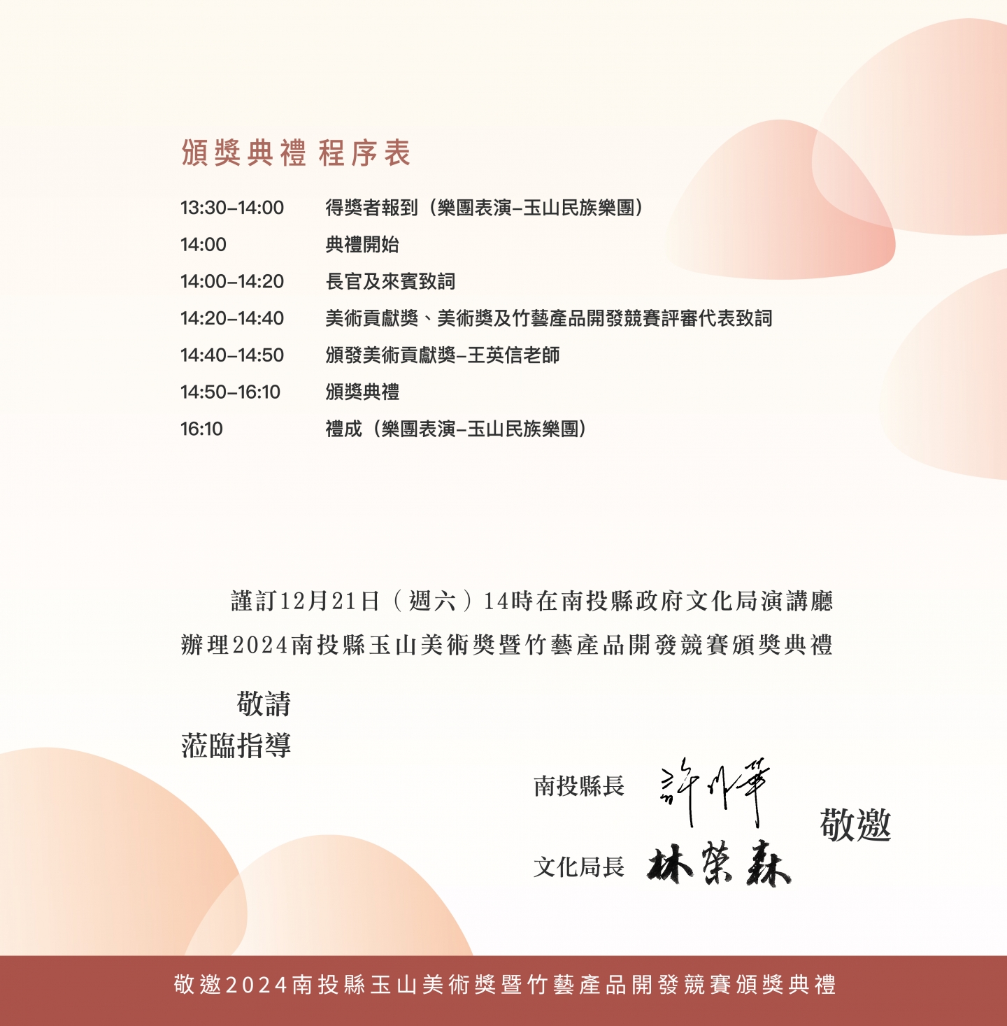 🎊狂賀🎊 王英信老師榮獲「2024南投縣玉山美術貢獻獎」 頒獎典禮12月21日14時舉行,歡迎大家一同觀禮!! 日期:113年12月21日(週六)下午14時 地點:南投縣政府文化局(南投縣南投市建國路135號 ) 地下一樓演講廳